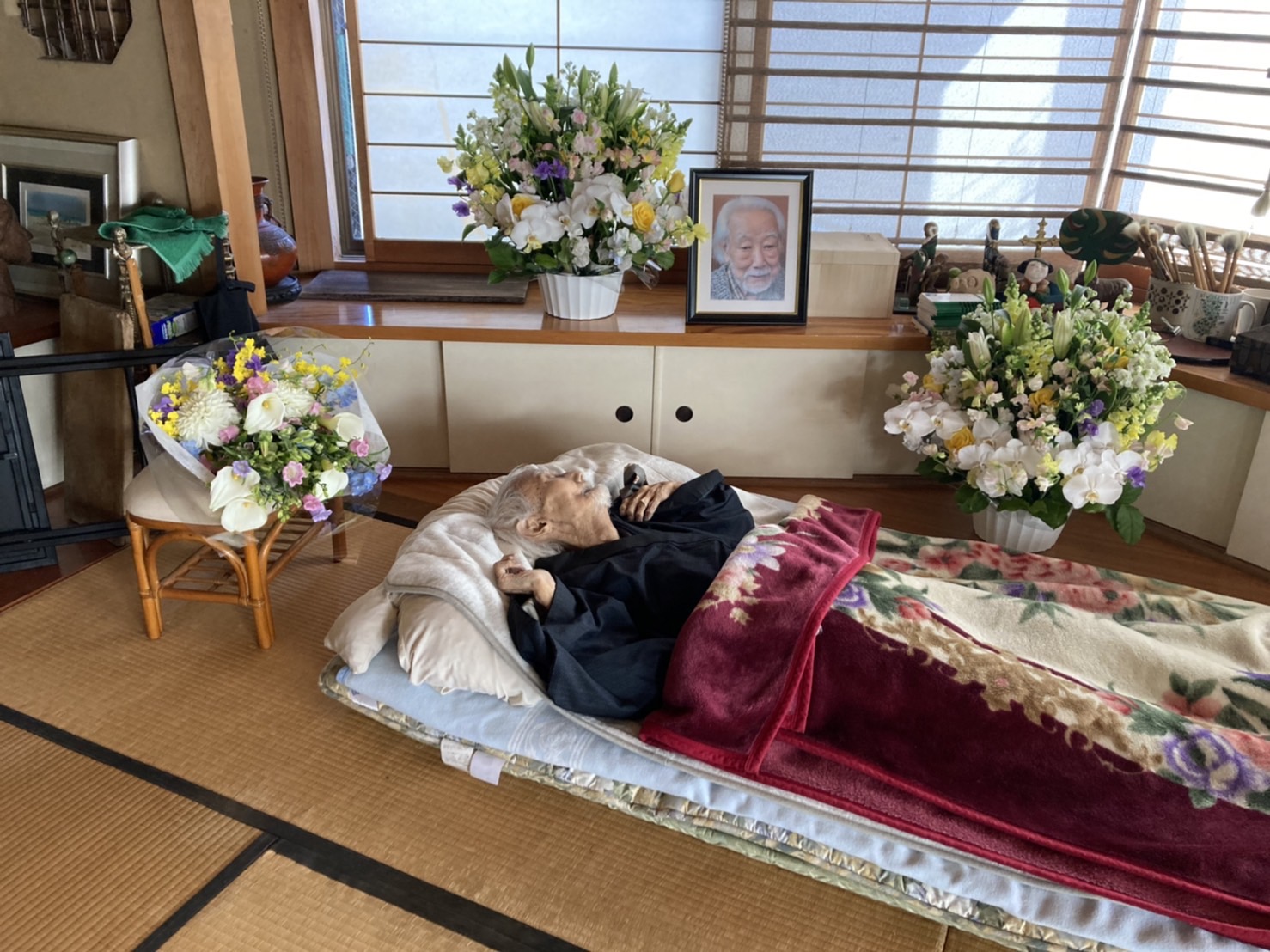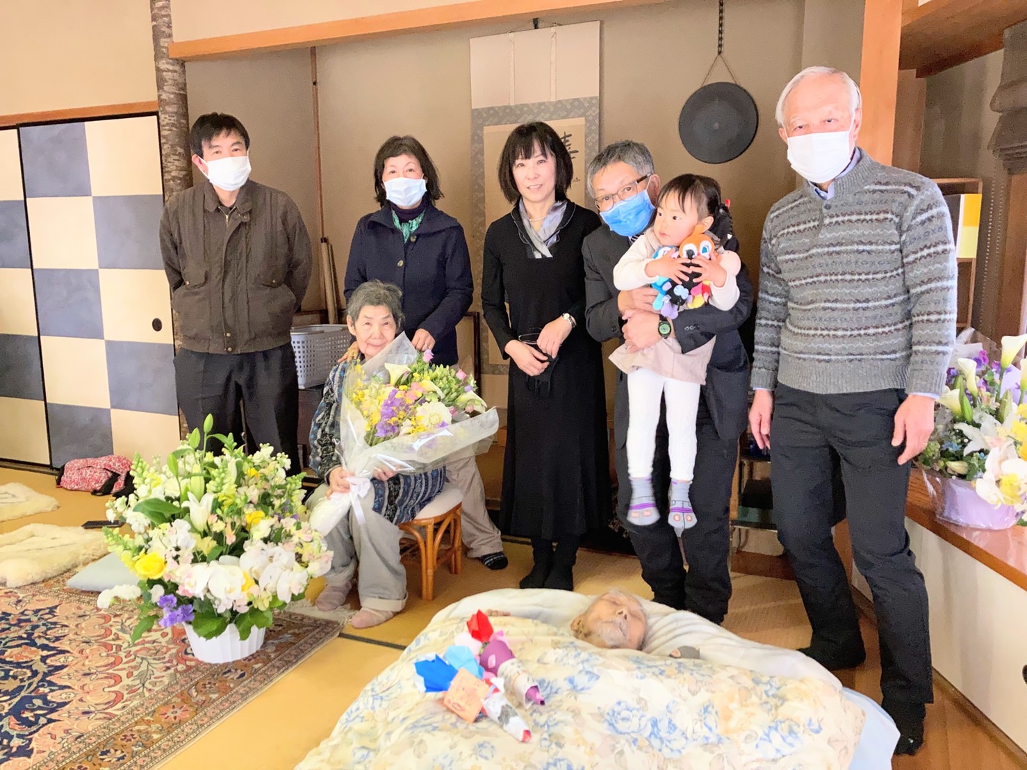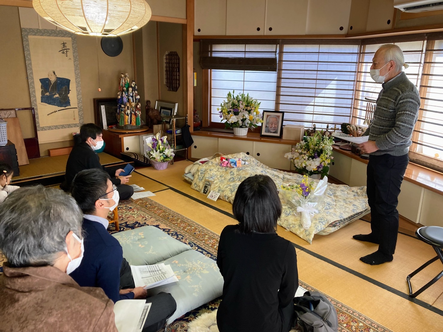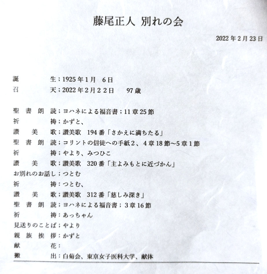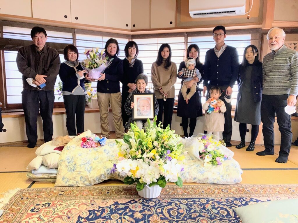正人さんの思い出 正人さんと尚子さん 2月22日の未明に正人さんは天に召されました。朝、尚子さんが見に行かれた時には両手を挙げて、息を引き取られておられたそうです。前の日にお会いした時にも、両手を挙げてくつろいだ様子で休んでおられました。たぶん両手を挙げてイエス様万歳と言われていたのではないかと思います。 23日に家族で集まり、家族葬が行われました。コロナの状況もありますので少人数の家族のみのお葬式でした。とても暖かいくつろいだ雰囲気での、今まで経験したことのない、正人さんにふさわしいお葬式でした。 お葬式の様子です。白鷺の大きな和室でおこなわれました。庭ではきれいな紅白の梅の木が満開でした。